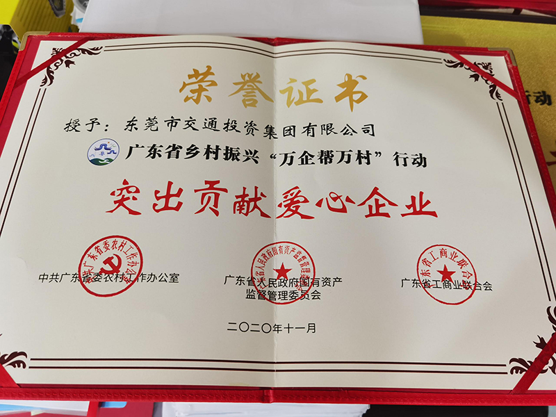 2020年市交投集團榮獲“廣東省鄉(xiāng)村振興‘萬企幫萬村’行動突出貢獻愛心企業(yè)”稱號