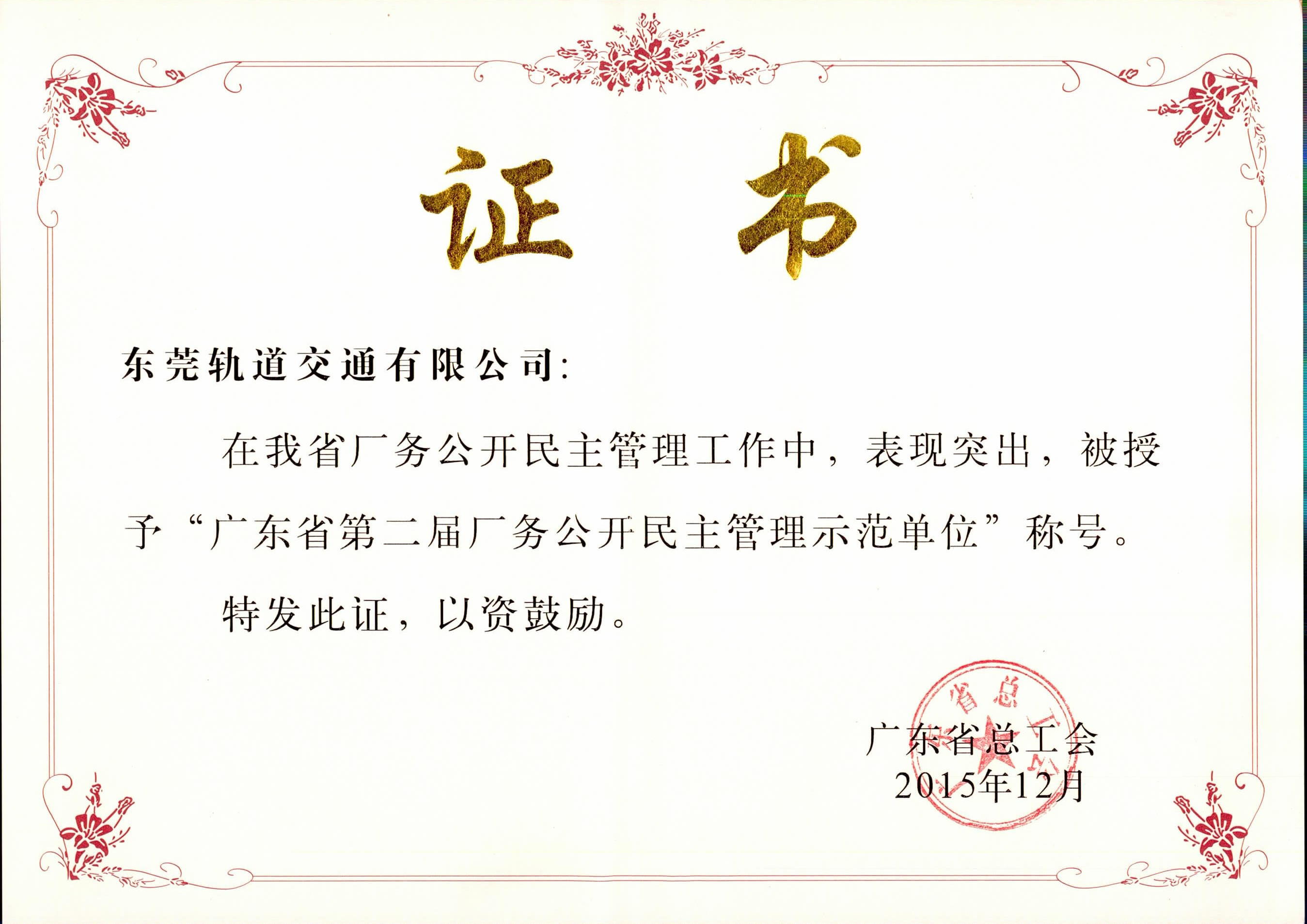 2015年,廣東省總工會授予市軌道公司“廣東省第二屆廠務(wù)公開民主管理示范單位”榮譽稱號。