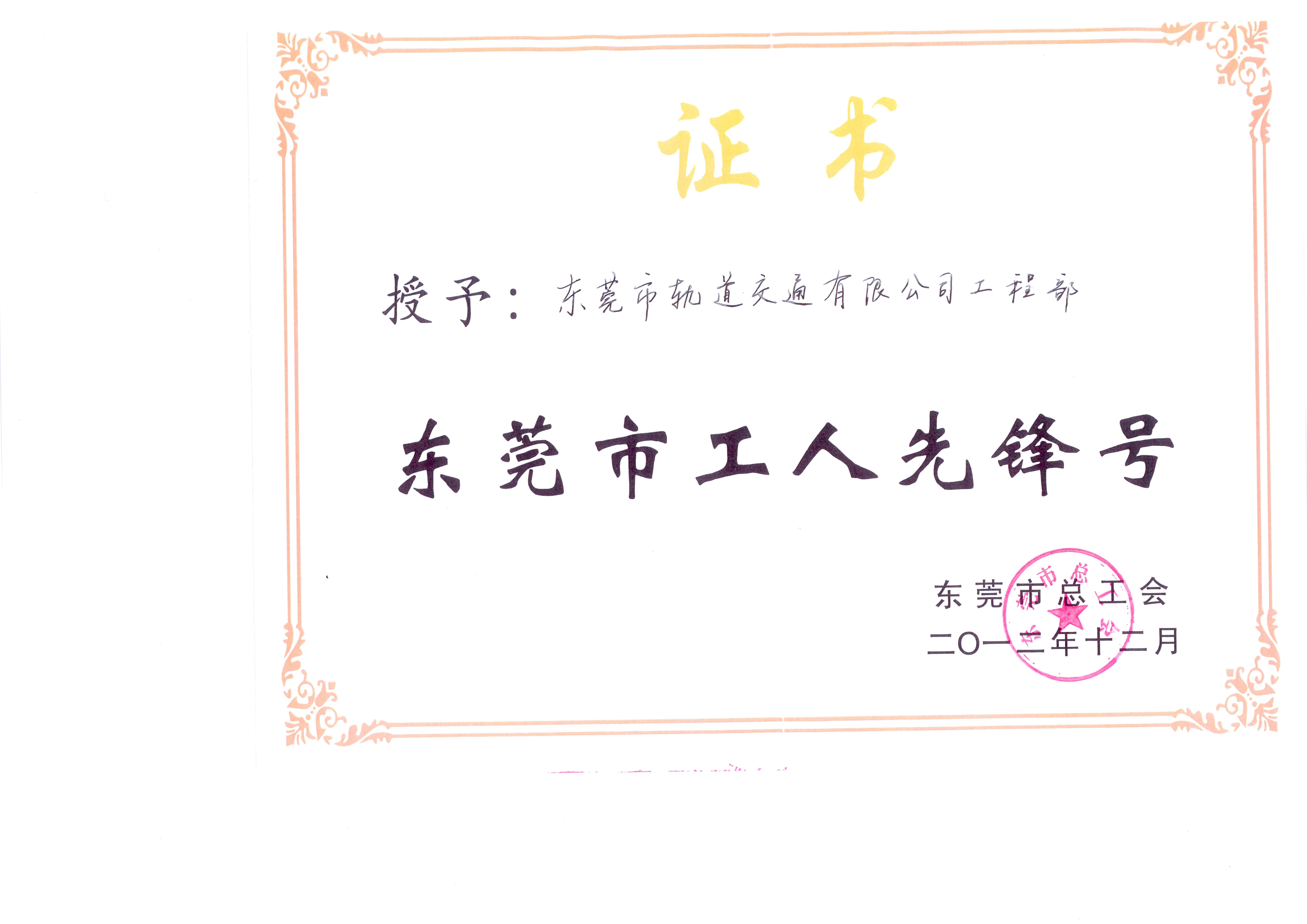 2012年12月,東莞市總工會授予市軌道公司工程部“東莞市工人先鋒號”榮譽稱號。