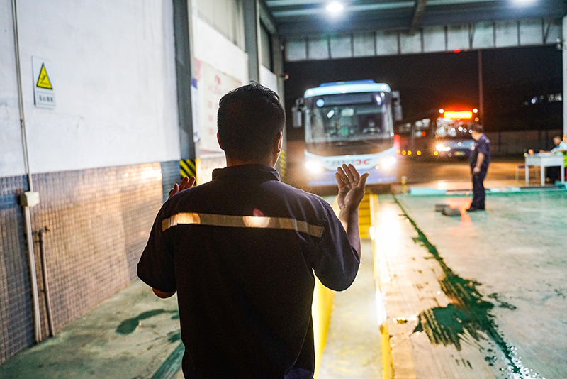 濱海灣公交公司長(zhǎng)安涌頭停場(chǎng)維修車(chē)間維修師傅引導(dǎo)車(chē)輛進(jìn)入檢修區(qū)域