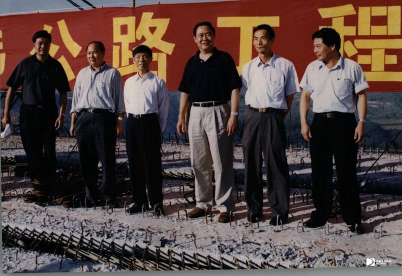 2004年6月15日,時(shí)任省交通廳陳冠雄副廳長(zhǎng)(左三)在路橋總公司總經(jīng)理鐘旭堆(右四)的陪同下視察常虎高速公路建設(shè)情況。