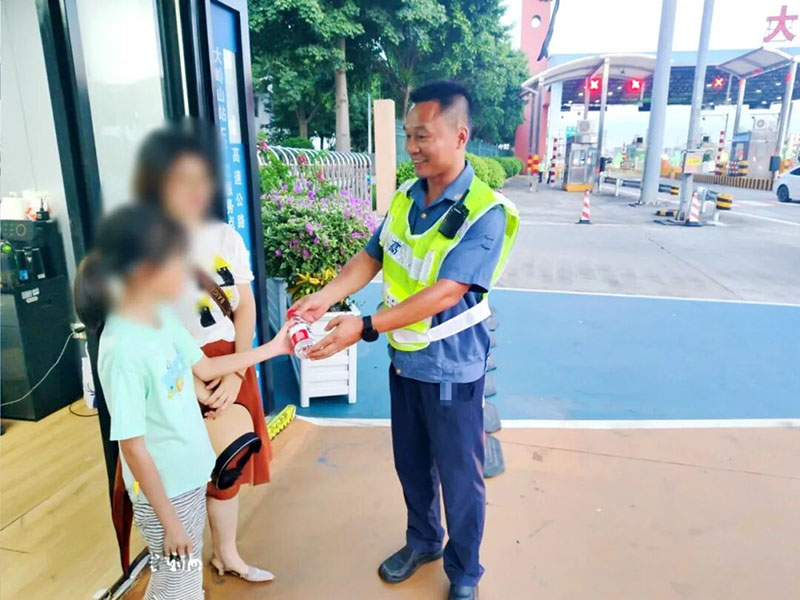 下午5時(shí)30分,何勇釗發(fā)現(xiàn)一位女士帶著小孩在收費(fèi)站旁焦急徘徊。主動(dòng)詢問(wèn)后得知,女士車輛突發(fā)故障,家屬正趕來(lái)但尚未抵達(dá)。"您別急,先過(guò)來(lái)休息。"他迅速引導(dǎo)她們到ETC服務(wù)亭,遞上礦泉水并安撫道:"大熱天,先喝點(diǎn)水。"隨后一邊幫忙安撫滯留群眾情緒,一邊聯(lián)系家屬,清晰告知最快抵達(dá)路線。看著孩子們放松地坐在椅子上喝水,女士緊鎖的眉頭終于逐漸舒展。