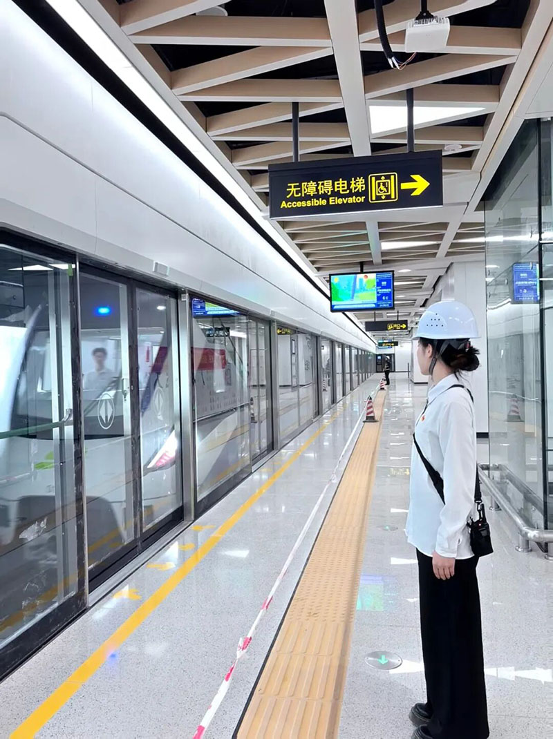 雙節(jié)期間,站務(wù)人員在站臺(tái)指定位置,投入列車試運(yùn)行接發(fā)工作,提前確認(rèn)進(jìn)路信號(hào)與站臺(tái)安全,緊盯車門與屏蔽門對(duì)位,確保列車平穩(wěn)??俊踩稣???蛰d試運(yùn)行階段的車站雖無(wú)熙攘的客流,但有工作人員堅(jiān)守的溫度。