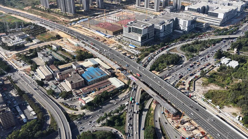 大嶺山互通A匝道2號橋地理位置特殊,它橫跨連接松山湖高新區(qū)與深圳的交通要道莞長路?!耙遣捎脗鹘y(tǒng)吊裝方式,至少得封路1個月,不管是市民通勤還是企業(yè)物流,都會受到嚴重影響。”據(jù)施工方中交二航局項目技術(shù)負責人介紹,為了破解“施工與保通”的矛盾,團隊創(chuàng)新采用的頂推施工技術(shù),讓鋼箱梁像“空中平移”一樣逐段推進,全程不中斷地面交通,最大程度減少了對市民出行和區(qū)域物流的影響。