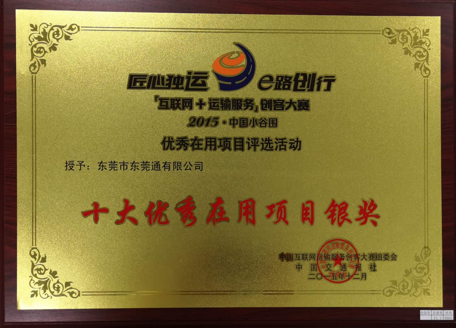 2015年12月,東莞通公司榮獲2015年中國(小谷圍)“互聯(lián)網(wǎng)+”運輸服務(wù)創(chuàng)客大賽“十大優(yōu)秀在用項目銀獎”。
