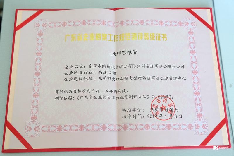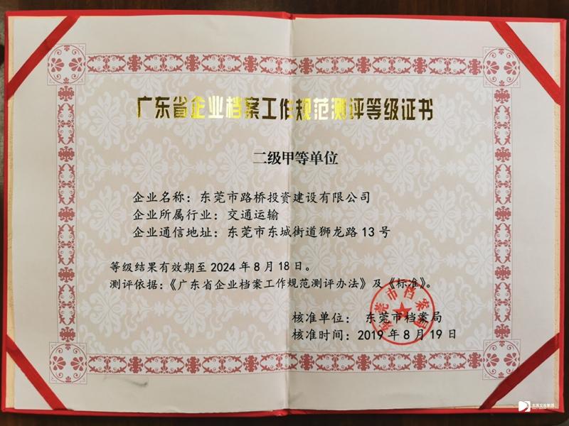 2019年8月,路橋公司獲得東莞市檔案局頒發(fā)“廣東省企業(yè)檔案工作規(guī)范測評二級甲等單位”