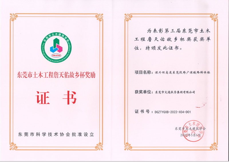 2022年5月,深外環(huán)高速東莞段跨廣深鐵路轉(zhuǎn)體橋榮獲第三屆東莞市土木工程詹天佑故鄉(xiāng)杯獎