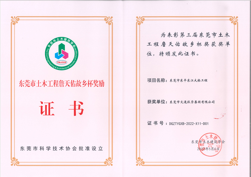 2022年5月,東莞市東平東江大橋工程榮獲第三屆東莞市土木工程詹天佑故鄉(xiāng)杯獎