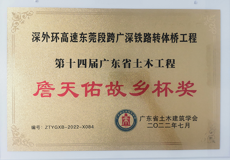 2022年7月,深外環(huán)高速東莞段跨廣深鐵路轉(zhuǎn)體橋工程榮獲第十四屆廣東省土木工程詹天佑故鄉(xiāng)杯獎