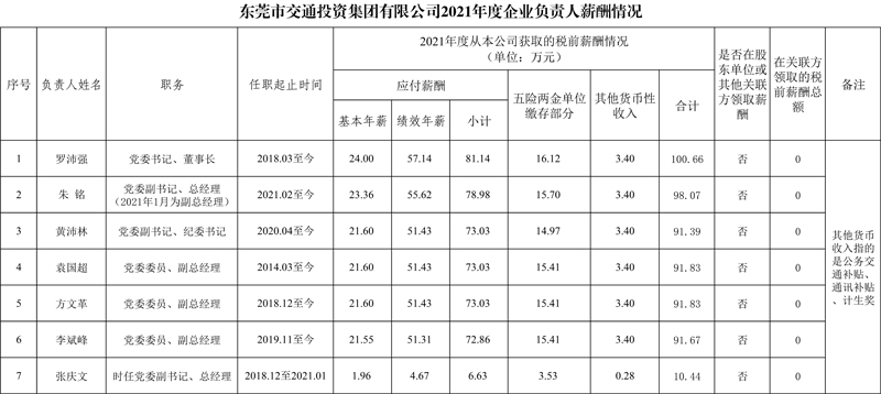 東莞市交通投資集團有限公司2021年度企業(yè)負責(zé)人薪酬情況